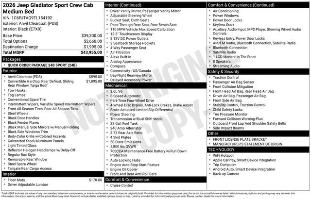 2026 Jeep Gladiator Sport Sport 3.6L V6 24V VVT Anvil Clearcoat