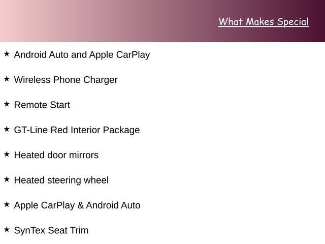 Dealer Discount of $970 off MSRP Android Auto and Apple CarPlay, Wireless Phone Charger, Remote Start, Apple CarPlay & Android Auto, GT-Line Red Interior Package, Heated door mirrors, Heated Front Bucket Seats, Heated steering wheel, SynTex Seat Trim.