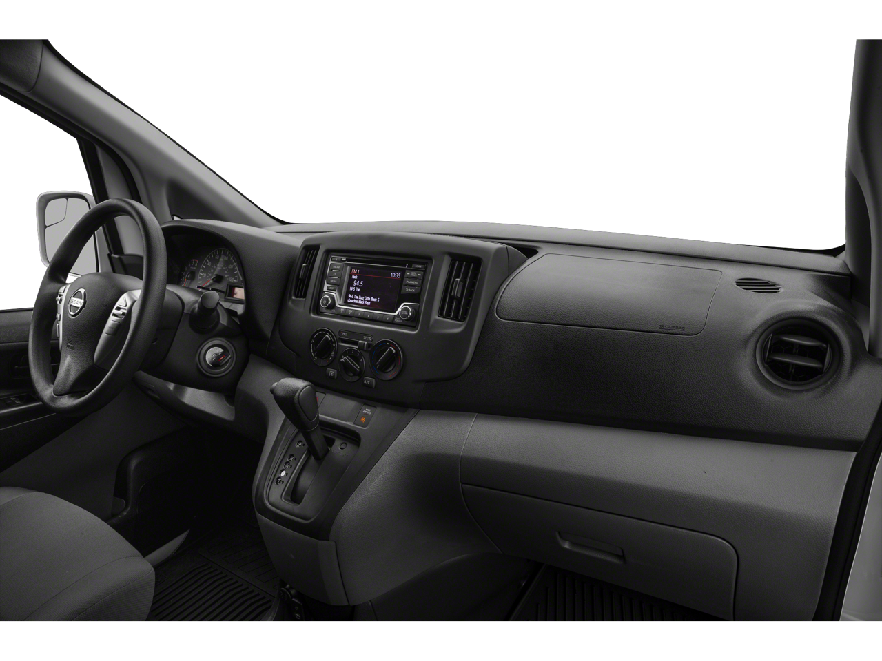 Inside, the NV200 SV is designed for function and comfort with front bucket seats, including a 6-way adjustable drivers seat and fold-flat passenger seat. Durable vinyl/rubber flooring, cloth seat trim, and a full cloth headliner support easy cleanup and long-term use. Convenience features include power windows with one-touch up/down, power door locks with auto-lock, cruise control with steering-wheel controls, manual air conditioning, multiple 12V power outlets, ample dashboard and door storage, cargo area lighting, and all-season floor mats.
