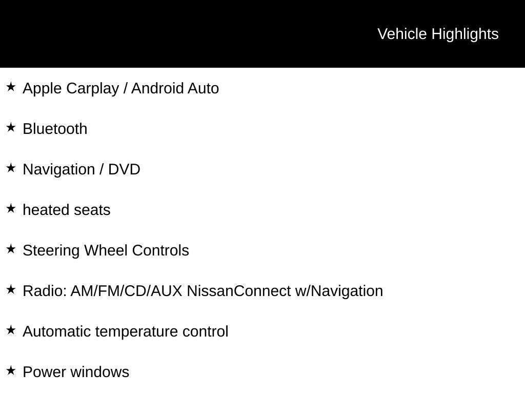 - NissanConnect featuring Apple CarPlay and Android Auto