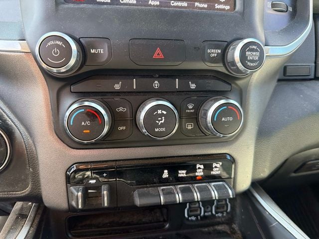115V Auxiliary Power Outlet, 115V Auxiliary Rear Power Outlet, 2 USB Full Function/Charge Only Media Hub, 2nd Row In Floor Storage Bins, 3 Rear Seat Head Restraints, 4 Way Front Headrests, 4-Wheel Disc Brakes, 400W Inverter, 48V Belt Starter Generator, 6 Speakers, ABS brakes, Air Conditioning, Air Conditioning ATC w/Dual Zone Control, AM/FM radio, Auto-Dimming Rear-View Mirror, Big Horn Badge, Big Horn IP Badge, Big Horn Level 2 Equipment Group, Black Premium Power Mirrors, Class IV Receiver Hitch, Cloth Bench Seat, Dampened Tailgate, Dual front impact airbags, Dual front side impact airbags, Foam Bottle Insert (Door Trim Panel), Front wheel independent suspension, Glove Box Lamp, GPS Antenna Input, Heated door mirrors, Heated Front Seats, Heated Steering Wheel, Illuminated entry, Leather steering wheel, ParkSense Front/Rear Park Assist w/Stop, Power 4-Way Driver Lumbar Adjust, Power 8-Way Driver Seat, Power Adjustable Pedals, Power door mirrors, Power steering, Power windows, Quick Order Package 27Z Big Horn, Radio data system, Radio: Uconnect 3 w/5 Display, Radio: Uconnect 4 w/8.4 Display, Rear 60/40 Folding Seat, Rear Dome w/On/Off Switch Lamp, Rear Power Sliding Window, Rear step bumper, Rear Wheelhouse Liners, Rear Window Defroster, Remote keyless entry, Security Alarm, SiriusXM Satellite Radio, Split folding rear seat, Steering wheel mounted audio controls, Sun Visors w/Illuminated Vanity Mirrors, Universal Garage Door Opener.