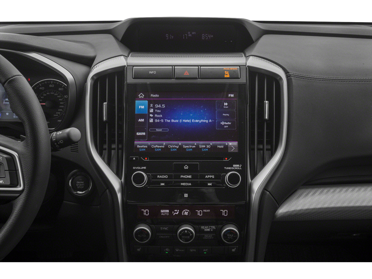 • Radio: Subaru STARLINK 8.0" Multimedia Plus System -inc: AM/FM stereo HD Radio w/single disc CD player, MP3/WMA/CRR/RW file capability, multi-touch gesture high resolution LCD display screen, voice activated controls, Bluetooth® audio streaming connectivity, Bluetooth® hands-free phone connectivity, Bluetooth® hands-free SMS text messaging connectivity (applicable w/compatible cell phone), Near Field Communication (NFC), iPod control capability, SiriusXM All Access radio (subscription required), SiriusXM Travel Link (subscription required), smartphone integration for Aha, Android Auto, CarPlay and Pandora, STARLINK cloud applications, steering wheel controls for audio and Bluetooth®, 6 speakers, 3.5mm auxiliary input jack and front and rear dual USB ports