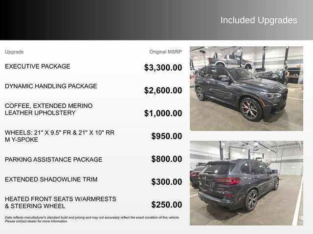 X5 M50i, 4.4L V8 DOHC 32V Twin Turbocharged, Coffee Leather, Active Park Distance Control, Active Roll Stabilization, Adaptive M Suspension Professional, Apple CarPlay & Android Auto Compatibility, Apple CarPlay Compatibility, Auto High-beam Headlights, Auto-dimming door mirrors, Automatic temperature control, Axle Ratio: 3.154, BMW Assist eCall, BMW TeleServices, Bumpers: body-color, Connected Package Pro, Delay-off headlights, Drive Recorder, Driver door bin, Driver vanity mirror, Dual front impact airbags, Dual front side impact airbags, Dynamic Handling Package, Executive Package, Extended Shadowline Trim, Exterior Parking Camera Rear, Four wheel independent suspension, Front dual zone A/C, Front Ventilated Seats, Fully automatic headlights, Garage door transmitter, Gesture Control, Glass Controls, harman/kardon Surround Sound System, harman/kardon® Speakers, Head restraints memory, Head-Up Display, Heated Front Seats, Heated front seats, Heated Front Seats w/Armrests & Steering Wheel, Icon Adaptive LED Headlights w/Laserlight, Increased Top Speed Limiter, Integral Active Steering, Leather steering wheel, M Sport Brakes w/Red Calipers, Memory seat, Occupant sensing airbag, Outside temperature display, Overhead airbag, Panoramic Sky Lounge LED Roof, Parking Assistance Package, Parking Assistant Plus, Power door mirrors, Power driver seat, Power moonroof, Power steering, Power windows, Rain sensing wipers, Rear air conditioning, Rear dual zone A/C, Rear Manual Side Window Shades, Rear window defroster, Rear window wiper, Rear-View Camera, Remote keyless entry, Roof rack: rails only, Speed-sensing steering, Steering wheel memory, Steering wheel mounted audio controls, Surround View w/3D View, Telescoping steering wheel, Ventilated front seats, Wheels: 21 x 9.5 Fr & 21 x 10 Rr M Y-Spoke.