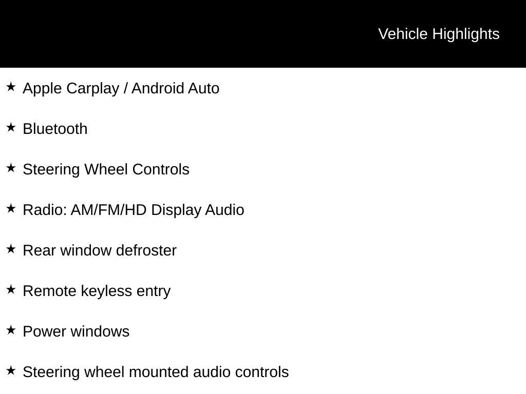- Radio: AM/FM/HD Display Audio -inc: 8" high resolution touch screen display, 4 speakers, wireless Apple CarPlay & Android Auto, Bluetooth® hands-free phone system w/voice recognition, dual USB ports and speed-sensitive automatic volume control