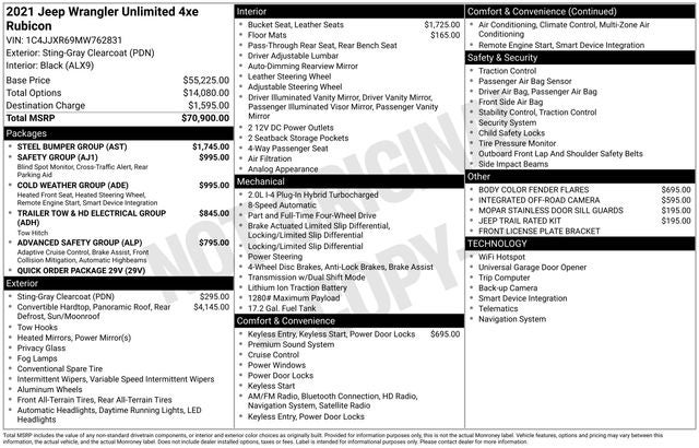 Wrangler Unlimited Rubicon 4xe, 2.0L I4 DOHC, Black Leather, 7 & 4 Pin Wiring Harness, 700 Amp Maintenance Free Battery, Adaptive Cruise Control w/Stop, Advanced Brake Assist, Advanced Safety Group, Apple CarPlay/Android Auto, Auto High Beam Headlamp Control, Auxiliary Switches, Blind Spot & Cross Path Detection, Class II Receiver Hitch, Cold Weather Group, Full Speed Forward Collision Warning Plus, Heated Front Seats, Heated Steering Wheel, Navigation System, ParkSense Rear Park Assist System, ParkView Rear Back-Up Camera, Power Top Quarter Window Storage Bag, Quick Order Package 29V, Rear Window Defroster, Rear Window Wiper/Washer, Remote Start System, Removable Rear Quarter Windows, Safety Group, Sky 1-Touch Power Top, Steel Bumper Group, Steel Front Bumper, Steel Rear Bumper, Trailer Tow & HD Electrical Group.