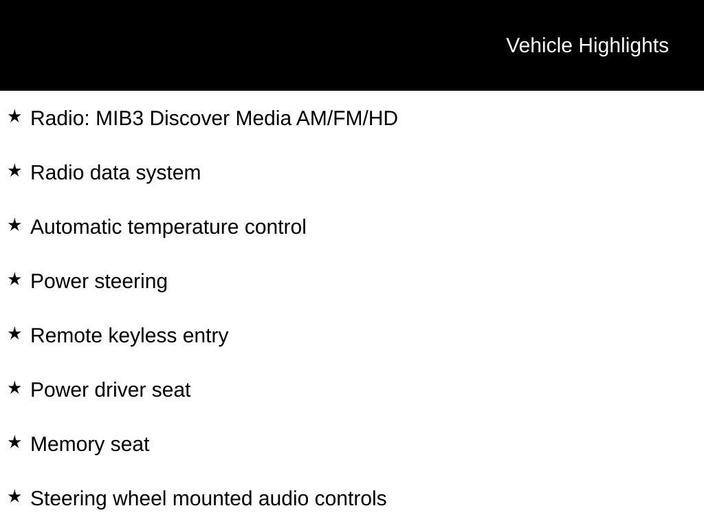 Technology is front and center with the MIB3 Discover Pro infotainment system featuring navigation, Apple CarPlay, Android Auto, Bluetooth® connectivity, and HD Radio capability. The harman/kardon premium audio system delivers exceptional sound quality, enhancing every drive. Steering wheel mounted audio controls, remote keyless entry, rain sensing wipers, speed sensitive wipers, and a rearview camera add both convenience and safety.