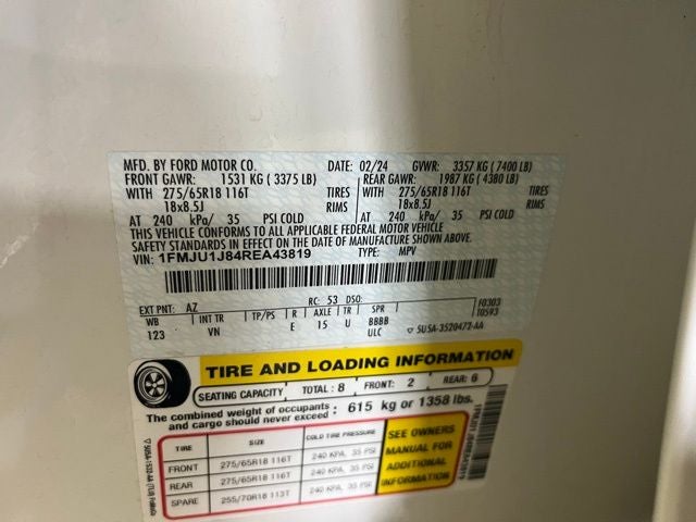 2024 Ford Expedition XLT Star White Metallic Tri-Coat 110V/150W AC Power Outlet, 2nd Row Power-Folding 40/20/40 ActiveX Bench Seat, 2nd Row Power-Folding Captain's Chairs, 3rd row seats: split-bench, 3rd Row Vinyl Head Restraints, 4-Door Intelligent Access (Lock/Unlock), 4-Wheel Disc Brakes, 6 Speakers, ABS brakes, Accent Color Painted Rear Bumper, ActiveX-Trimmed 1st & 2nd Row Seats, Advanced Security Pack, Air Conditioning, Alloy wheels, AM/FM radio: SiriusXM with 360L, Ambient Lighting, Auto High-beam Headlights, Auto-dimming Rear-View mirror, Automatic temperature control, Brake assist, Bumpers: body-color, Cloth Front Captain's Chairs, Compass, Delay-off headlights, Driver door bin, Driver vanity mirror, Dual front impact airbags, Dual front side impact airbags, Electronic Stability Control, Emergency communication system: SYNC 4 911 Assist, Equipment Group 202A High Package, Exterior Parking Camera Rear, Four wheel independent suspension, Front anti-roll bar, Front Bucket Seats, Front Center Armrest, Front dual zone A/C, Front License Plate Bracket, Front reading lights, Fully automatic headlights, Garage door transmitter, Heated door mirrors, Heated Steering Wheel, Heated/Ventilated Front Seats, Illuminated entry, Leather steering wheel, Low tire pressure warning, Navigation system: Connected Navigation, Occupant sensing airbag, Outside temperature display, Overhead airbag, Overhead console, Panic alarm, Passenger door bin, Passenger vanity mirror, Power door mirrors, Power driver seat, Power Liftgate, Power steering, Power Tilt/Telescopic Steering Wheel w/Memory, Power windows, Power-Adjustable Pedals w/Memory, Power-Folding Sideview Mirrors w/Autofold, Radio data system, Radio: AM/FM Stereo w/MP3 Capable, Rear air conditioning, Rear anti-roll bar, Rear reading lights, Rear window defroster, Rear window wiper, Reclining 3rd row seat, Remote keyless entry, Remote Start, SecuriCode Keyless Entry Pad, Security system, SiriusXM w/360L, Speed control, Speed-sensing steering, Speed-Sensitive Wipers, Split folding rear seat, Spoiler, Steering wheel mounted audio controls, SYNC 4 w/Enhanced Voice Recognition, Tachometer, Telescoping steering wheel, Tilt steering wheel, Traction control, Trip computer, Variably intermittent wipers, Voltmeter, Wireless Charging Pad.