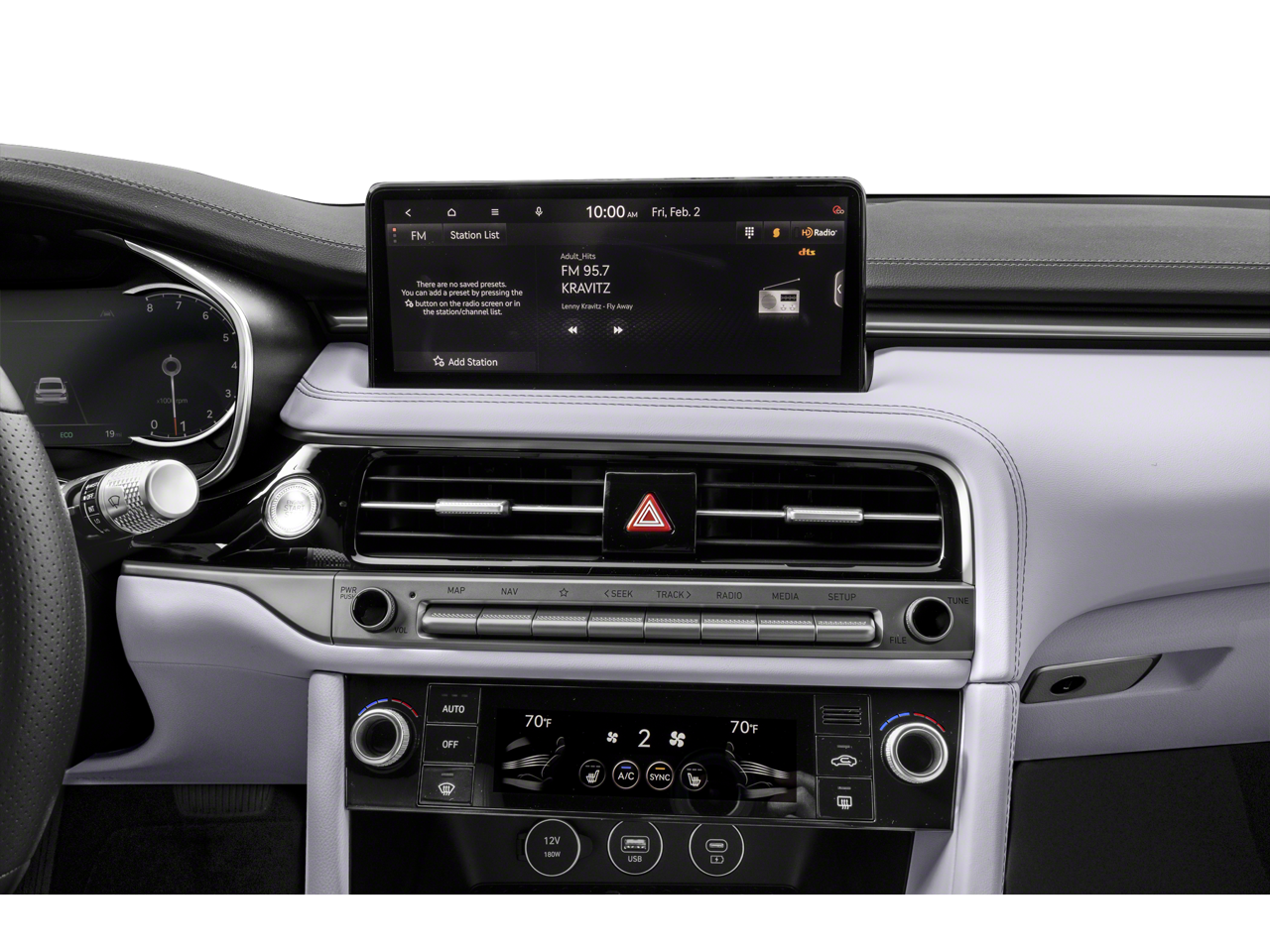 • Radio: AM/FM/SiriusXM/HD Audio System -inc: 6 speakers, 5th generation navigation system w/10.25" touchscreen, dynamic voice recognition, connected routing, over the air updates, Android Auto and Apple CarPlay, SiriusXM Radio w/90-day trial subscription (not available in Alaska or Hawaii), Genesis connected services, Bluetooth® hands-free phone and audio streaming system