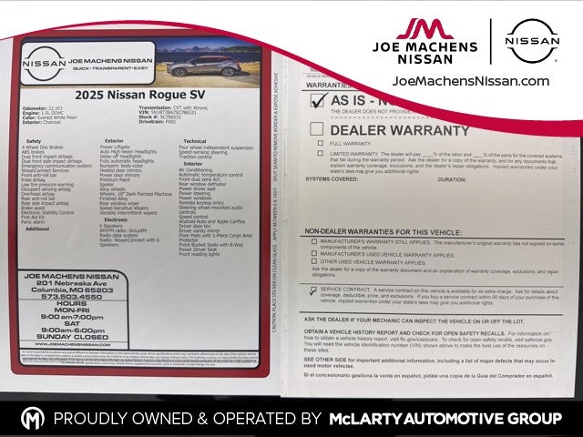 CARFAX One-Owner. Everest White Pearl 2025 Nissan Rogue SV FWD CVT with Xtronic 1.5L DOHC Rogue SV, 4D Sport Utility, 1.5L DOHC, CVT with Xtronic, FWD, Everest White Pearl, Charcoal Cloth.